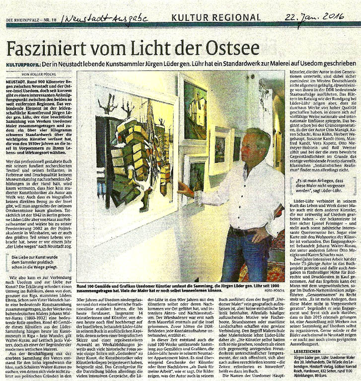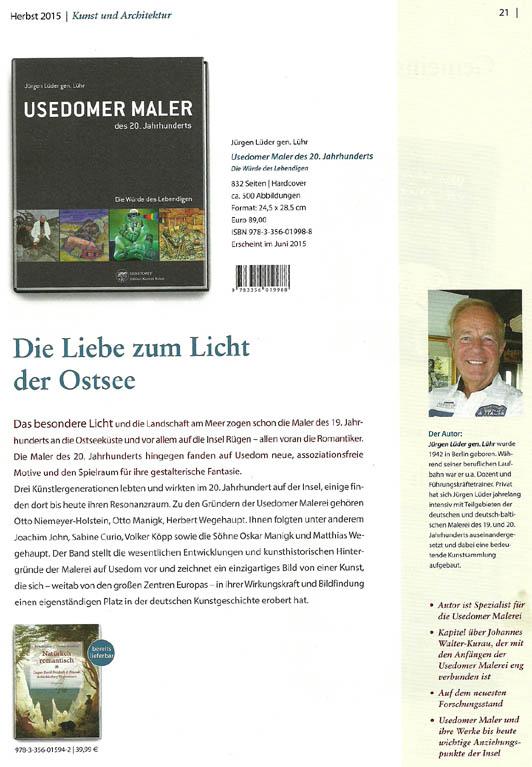 In einer erweiterten und verbesserten Neuauflage ist 2015 ein Standardwerk über die Usedomer Maler beim Hinsdorff Verlag Rostock erschienen: Jürgen Lüder gen. Lühr, Usedomer Maler des 20. Jahrhunderts - Die Würde des Lebendigen, 832 Seiten, Hardcover mit Bezug, über 1.000 Abbildungen, Format: 24,5 x 28,5 cm, Euro 89,00, ISBN 978-3-356-01998-8.In seinem Fachbuch "Das neue Stress-Lexikon", (www.bod.de), Paperback 412 Seiten, 24 Farbgrafiken, 24,90 €, erläutert er alles Wesentliche zum Stress von A wie A-Typ, Autogenes Training, Anti-Aging über Burnout, Emotionale Intelligenz, Endogener Stress, Gehirn-Engineering, Herzinfarkt, Hörsturz, Konflikte, Mobbing, Stalking, Posttraumatische Belastungsstörungen, Proxemik, Schul-Stress, Soziale Geborgenheit, Wassergymnastik bis hin zu Z wie Zilgrei.